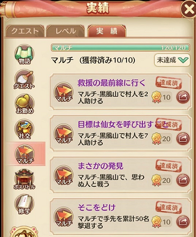 マルチの実績は 10個(2022年4月現在)。黒風山メイン。このうち、4. 手先50名 と 5.頭領10回 の実績報酬は元宝200個ずつ。