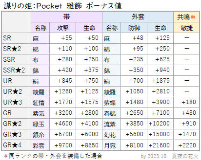 雅飾 ステータスup 表