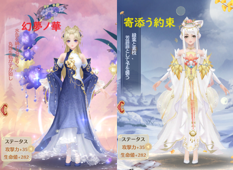 「寄添う約束」は、同名の華服があるけど、たぶん、上の白×黄 が S12 華服なので、そっちかな?(未確認)。追記:幻夢ノ華も同名色違いがあります(上の紺色はS11)。どっちなのか未確認。
