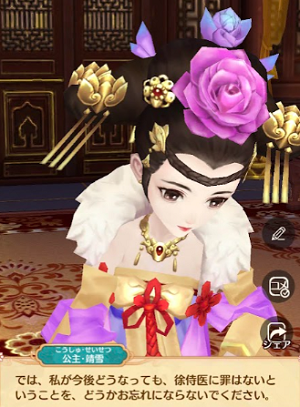 主人公は徐容遠と共に靖雪公主の説得を試みる。公主は自分には勿体ない、降嫁すれば幸せになれると言う徐容遠。公主に、私が嫁げばそれでいいの?と問われ、はい!と即答。公主落胆(哀)。