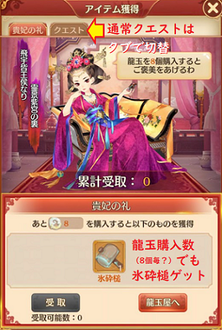 あとは、1回限りの宮廷秘宝¥1200で 25氷砕槌(ここまでで105砕き)。400回砕く=完走には、2360 龍玉、約 3 万円(この計算あってる??)