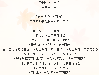 明日夕方(1/20)、物語の更新や主人公レベルや突破や覚醒の上限解放などなどのリソース更新があるようです。