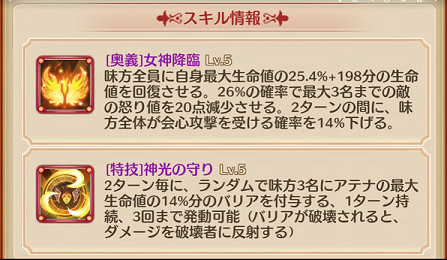 アテナの回復力はそこまで高くないので、強みは反射バリアによる与ダメと、怒り値吸収と、会心受け辛くする根性up、だと思う。